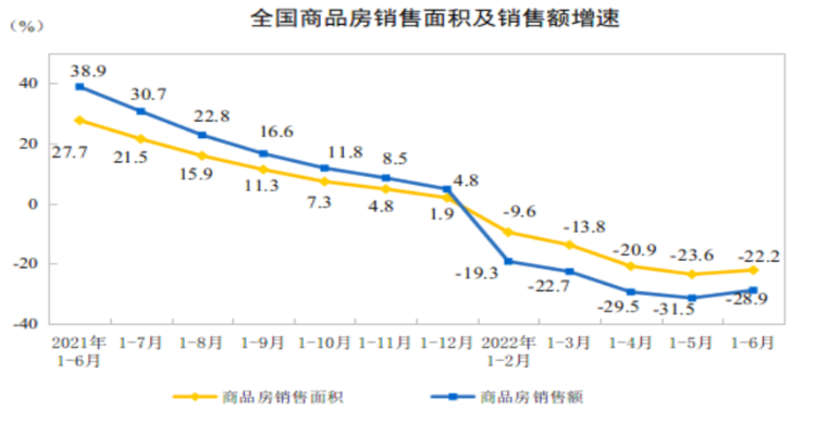 据国家统计局,今年1-6 月销售面积同比-22.2%,6 月单月销售面积同比-18.3%,单月增速较上月上升13.5百分点;6 月单月销售金额同比-20.8%,单月增速较上月上升16.9百分点。