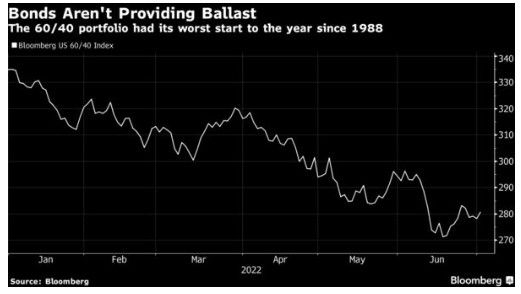 根据数据显示,由于不断上升的通胀和加息令股市和债市同时下跌,一项追踪60/40投资策略的彭博指数在经历了多年上涨后,在今年前六个月大跌了17%。