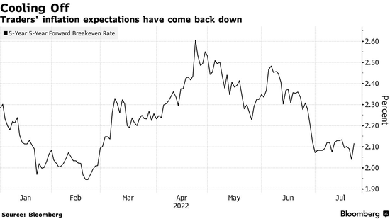 7月21日,作为衡量投资者通胀预期的一个关键指标,未来5年之5年期预期通胀率(five-year, five-year forward breakeven rate)跌至2.02%,略低于2月18日的水平和2021年初以来的最低水平。尽管该指标在7月22日有所上升,但仍远低于今年4月份触及的2.57%的水平,而美联储试图将美国通胀率稳定在的2%的低位。