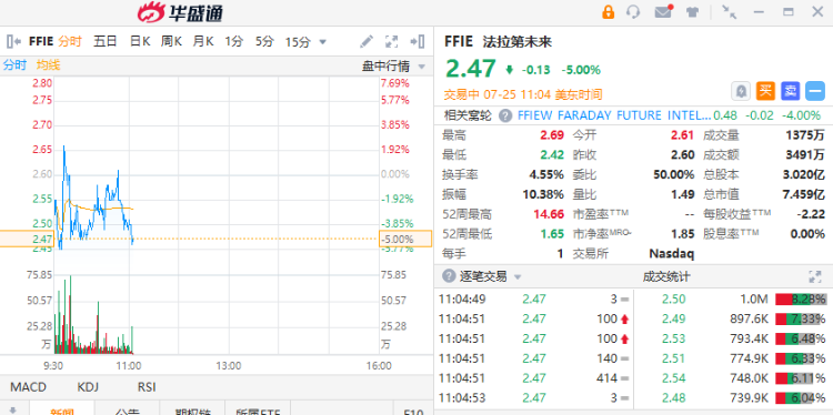 华盛资讯7月25日消息,美股盘中,新能源车板块多数下挫,截止发稿,法拉第未来跌5%,报2.47美元。Lucid跌超4%,图森未来跌超3%,小鹏汽车跌超2%,Rivian跌超1%。