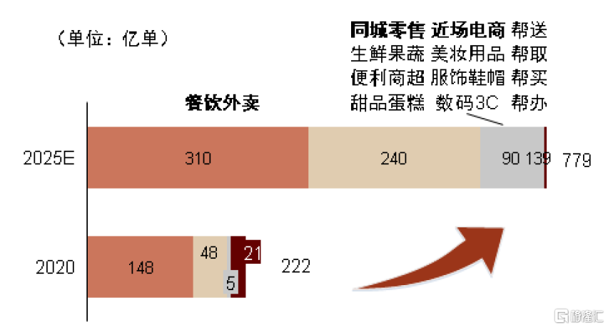 非餐配需求持续提升,未来五年将实现高于行业增速。据艾瑞咨询,即时配送行业单量将从2021年的323亿单增长到2025年的779亿单,对应复合增速25%,其中餐饮外卖复合增速达12%,非餐配送场景复合增速更高达38%。我们认为此次疫情,进一步推动即时零售发展,通过即时配送实现万物到家的用户习惯得以培养,餐饮外卖需求基本持平,同城零售和跑腿业务尽管较疫情期间回落,仍保持同比较高增长。