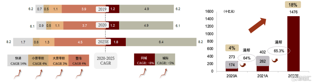 资料来源:CIC,中金公司研究部;注:右图百分比4%和18%为数字货运平台GTV占总公路运输市场比例,即行业数字化渗透率