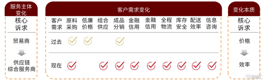 与制造业企业深度合作,从单环节拓展到全程供应链。日本综合商社通过产业融资等综合服务来与产业链各节点企业建立牢固的合作关系,而国内的大宗供应链综合服务商也正在发力从单环节的采购分销拓展到全程供应链服务,这样有利于服务商把控上下游的趋势变化,并增强客户的粘性。