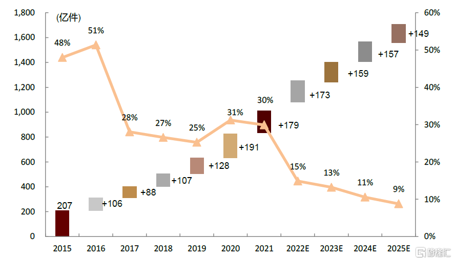 注:左轴为业务量及每年增量,右轴对对应同比增速