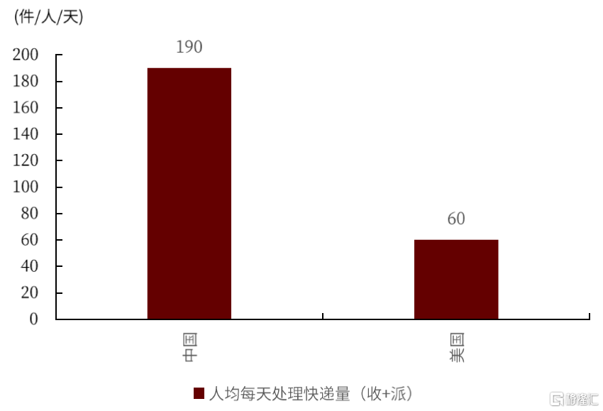 图表:快递员人均每天处理的快递业务量中美对比(2019年)