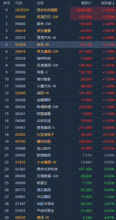 阿里巴巴-SW大涨近6%,隔夜阿里巴巴发布公告拟双重上市,有望纳入港股通;其他互联网概念京东健康涨2.81%,百度集团-SW涨1.67%,网易-S涨1.6%,快手-W涨2.16%。