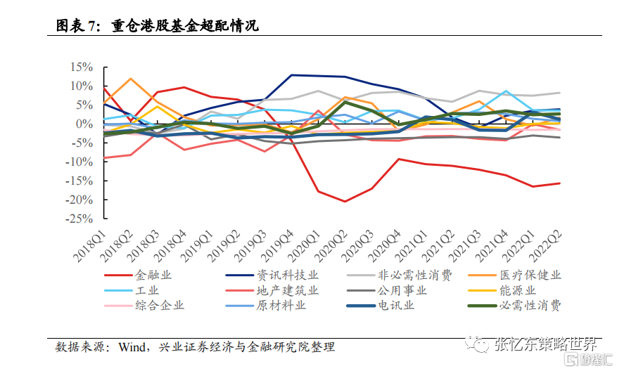1)除金融业明显低配外,其余行业超配比例在-10%~10%区间内波动,表明基金行业配置结构整体围绕港股通行业市值结构波动。