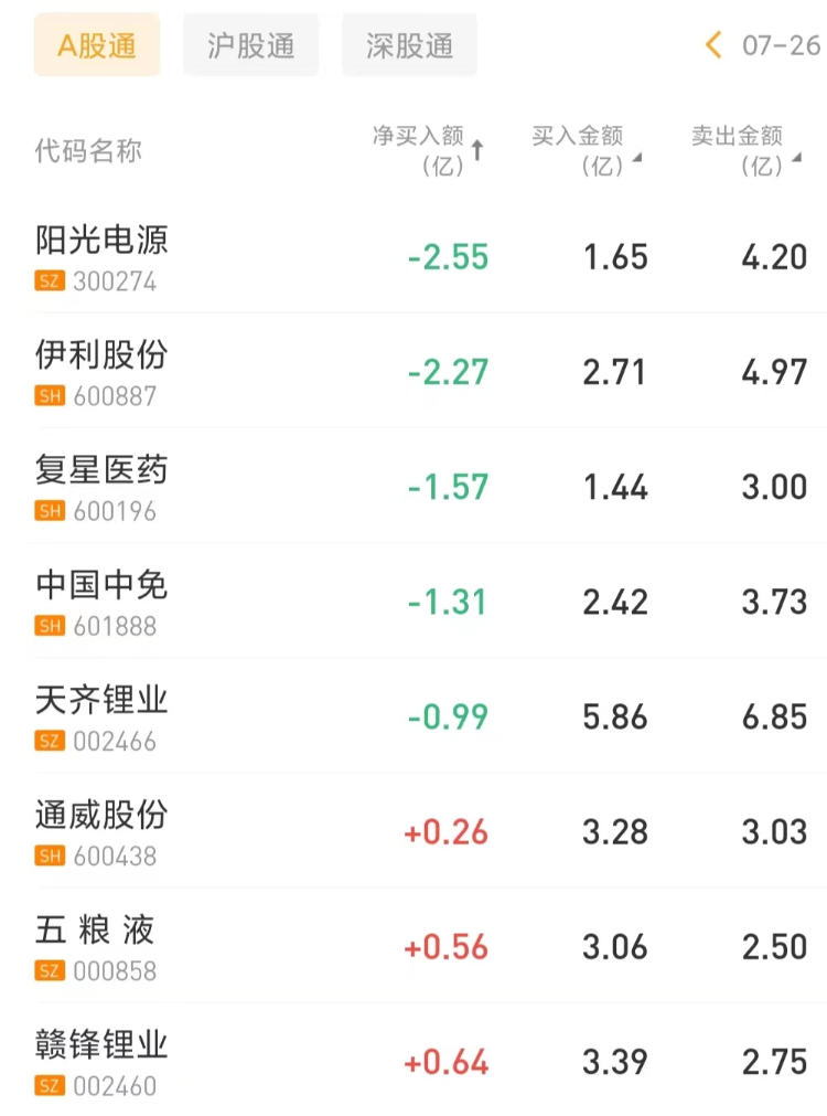 今日北上资金净卖出阳光电源2.55亿元,伊利股份遭净卖出2.27亿元。