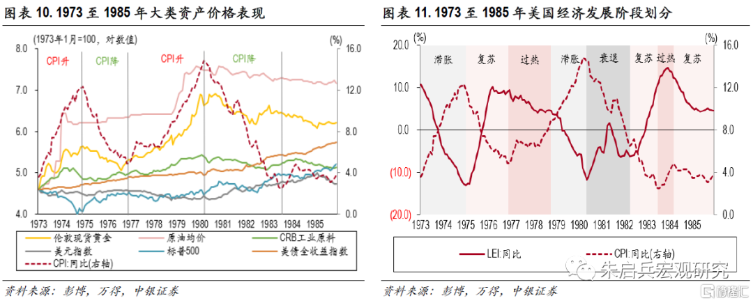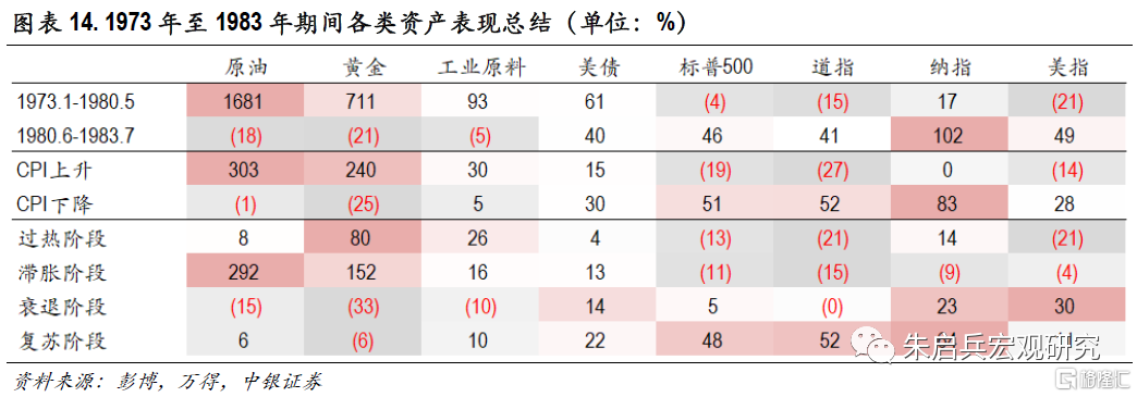 其次,我们总结了大通胀到通胀缓和期间的资产表现。1973年至1983年,按照CPI增速变化可以把这段时期划分为通胀上行期和下行期;结合美国经济形势和CPI增速变化,可以将美国经济划分为衰退、复苏、过热和滞胀四个阶段。期间,实物资产表现总体好于金融资产:实物资产中的原油表现好于黄金、工业原料;金融资产中的美债表现好于美股、美指。
