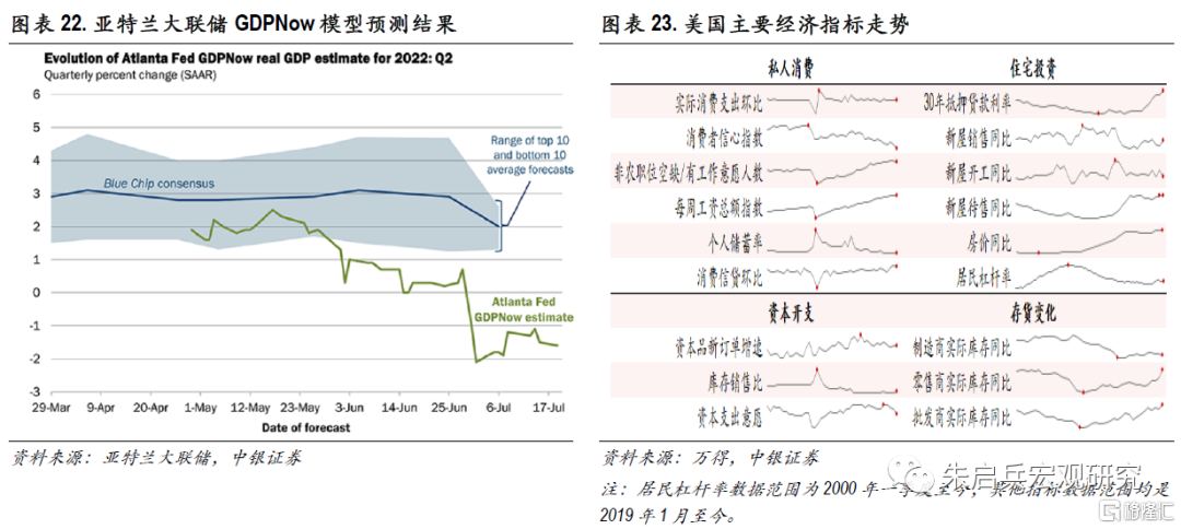 最后,我们对美联储政策和大类资产表现进行了展望。基于EIA对于国际原油价格年内持续回落的预测,我们预计美国CPI同比或已经触顶,不过年末CPI增速仍将处于高位。亚特兰大联储GDPNow预测模型显示,美国经济可能已经陷入技术性衰退。但美国私人消费尚具韧性。未来经济出现轻度衰退的可能性较大,年内美联储紧缩可能放缓。预计下半年金融资产表现排序是美元>美债>美股;实物资产表现排序是黄金>原油>工业原料。