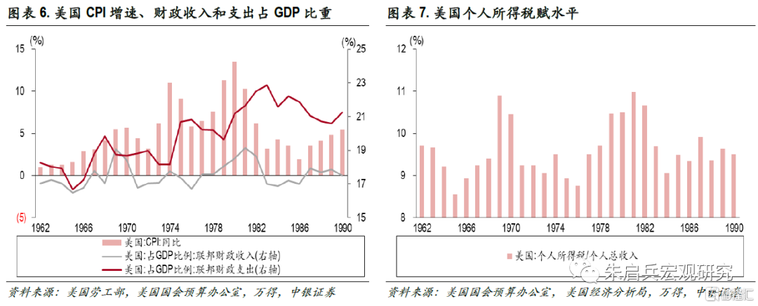 1965年约翰逊成功连任总统后,宣布实施伟大社会计划。1967年开始,国内社会保障计划带动联邦财政支出大幅攀升,占GDP比重最高升至1984年23%,但财政收入没有太大的趋势性变化。由于大幅增长的转移支付主要用在了收入再分配上,导致不同利益群体很难就可接受的税收水平达成共识,公开征税很可能激化各阶层的矛盾。因此,政府只好诉诸于通胀,作为临时增收手段。这带来的结果是,通胀指标和财政赤字占GDP比重同时从1960年代中后期开始走高(见图表6)。