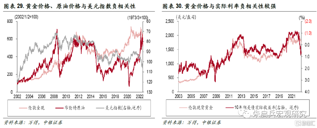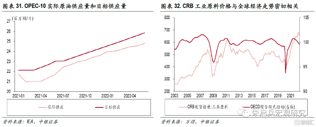 预计实物资产表现:黄金>原油>工业原料。1)黄金是以美元计价的无息资产,美元指数和实际利率均会影响金价。短期美元和美债利率仍有上行空间,预计黄金价格仍将承压。在美联储紧缩放缓之后,随着美元和美债利率回落,金价可能重获上行动力(见图表29、30)。2)国际原油以美元计价,美元升值也会在一定程度上影响油价表现(见图表29)。目前俄乌冲突带来的原油供应风险减弱,全球经济衰退预期导致原油价格承压。不过,欧盟对俄罗斯制裁风险仍然存在,并且OPEC主动增产意愿较弱(见图表31),预计将对中长期油价形成支撑。3)工业原料价格与全球经济走势密切相关,经济下行趋势将对工业原料价格形成压制(见图表32)。