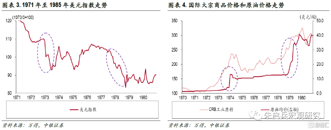 美元由急贬转为急升。1973年至1980年5月,美元指数累计下跌21%,由于包括黄金在内的大宗商品价格均以美元计价,因此商品价格上涨一定程度上受到美元贬值影响。尤其是,1977年10月至1978年10月,美元快速贬值20%,引发国际货币危机。贬值期间,美国政府忽视美元的国际地位,长期听其自然发展。直到1978年10月,美国政府对于美元持续贬值会很快导致国际金融危机也感到恐慌,因此次月宣布与西德、瑞士和日本联合对外汇市场实施大规模干预,美元贬值才被制止。沃尔克就任美联储主席之后,为反通胀采取的高利率政策引起美元持续升值,从1980年5月的96最高升至1985年2月的165。