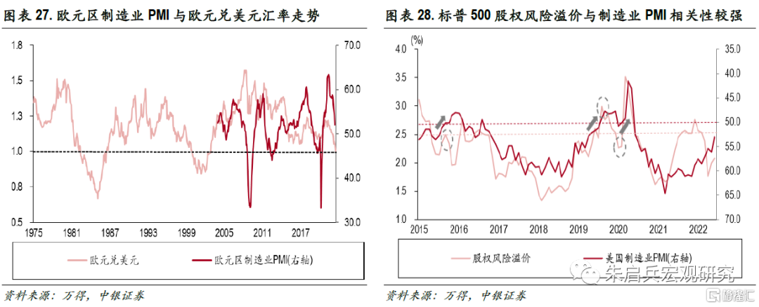 预计金融资产表现:美元>美债>美股。美联储主席鲍威尔在6月FOMC会后新闻发布会上表示,如果没有有力的证据表明通胀下降,美联储不会宣布胜利。6月美国CPI增速继续超预期,意味着短期美联储不会放缓紧缩节奏。1)美元指数短期仍有上行空间,在美联储紧缩放缓之后可能触顶回落。当然,如果美国通胀韧性超出预期,美联储不得不加大紧缩力度,美元指数更是易上难下。此外,即便欧元已经跌破平价,但欧洲经济下行压力、能源供应风险以及欧元区内部融资成本分化等问题,均可能继续施压欧元,进而支撑美元(见图表27)。2)美债收益率短期可能上行,在美联储放缓紧缩节奏之后转为下降,总体呈现震荡走势。3)在美债收益率短期上升过程中,美股尤其是成长股承压。如果年底美国制造业PMI降至50以下,股权风险溢价可能升至2.5%上方(见图表28)。假设年底美债收益率和股权风险溢价均为3%,对应的标普500市盈率为16.7倍,低于目前的19倍。2021年底预期未来12个月每股收益是216,据此计算标普500的合理水平是3600点,这意味着未来仍存在近10%的下跌空间。