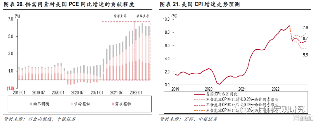 美国高通胀是疫情之后需求端恢复明显快于供给端的结果。2022年以来,受俄乌冲突影响,供给因素对美国通胀的影响加剧(见图表20)。尤其是,能源价格上涨推动整体CPI同比增速持续创新高。根据EIA的最新预测,布伦特油价预计在6月份之后见顶回落。我们根据油价变动情况以及美国CPI中的能源权重大小(2019年至2020年权重为7.348%),可以粗略估算油价变化对CPI环比增速的影响。并且,假设下半年不含能源的CPI环比增速分别为0.2%、0.4%和0.6%,据此测算得出,年内美国CPI同比增速可能自6月份开始见顶回落。如果不含能源CPI环比增长0.6%,美国CPI同比预计在8、9月份小幅反弹,四季度再转为回落,年末仍接近8%。如果不含能源CPI环比增长0.4%、0.2%,预计年内美国CPI同比将持续回落,年末分别降至6.7%、5.5%(见图表23)。