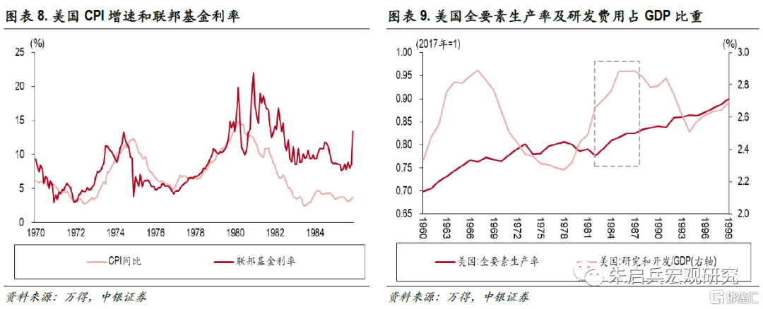 供给学派的学说是里根执政的重要理论基础,认为美国经济困境来自储蓄率下降、技术革新速度放缓等原因导致商品竞争力下降,强调从供给方面寻求经济对策,主张减税、削减政府支出、减少政府干预。里根上台后积极向国会提出减税计划,并放松了多个行业的干预和管制。例如,1981年签署“解除石油价格和分配管制法案”,使美国国内油价首次与国际接轨,刺激了石油公司增加在美国国内的油气勘探和生产投资。但1981年至1982年这些政策并没有发挥应有的作用,失业率反而继续上升,导致里根在1982年11月中期选举前的支持率明显下降。出于对新兴市场债务违约威胁国际金融体系稳定的担忧,美联储自1982年下半年开始降息。受此影响,美国经济自1982年四季度开始复苏。中期选举之后,里根积极推动产业结构转型,改造并资助传统工业部门,增加支持电子、光导纤维和新能源开发等新兴工业部门的科研投资,为经济增长提供新动力。1983年至1988年,美国研发费用占GDP比重上升0.2个百分点,全要素生产率增长7.3%(见图表9)。