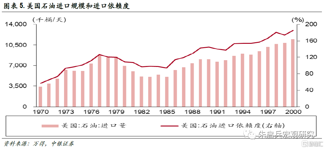 价格管制导致国内石油供给不足,加剧进口依赖。尼克松执政时期,由于存在价格管制,美国原油价格被冻结,国内原油生产受到抑制,消费被变相鼓励,导致美国原油进口规模明显攀升(见图表5)。为了解决石油供给不足问题,1973年8月,尼克松政府进一步实施石油价格管控措施,将老油(1973年前投产的油井并且不超过1972年产量的原油)价格限制在5.25美元,新油(1973年前投产的油井但超过1972年产量的部分、1973年后投产的油井)和进口原油价格不受控制。按照原计划,1974年4月结束石油价格管制,实现国际国内油价接轨。不过,第一次石油冲击爆发后,国际油价飙升。为了控制本国石油价格,尼克松政府颁布了“紧急石油分配法案”,同时根据该法案颁布联邦能源管理行政法令,对原油产量采取“老油”和“新油”两级价格机制进行管制。福特上任后继续推动国家能源管理,“1975年能源政策与节约法”提高了两类油的价格水平,但仍与国际油价存在差距。卡特上任之后,签署了“1978年国家能源法案”,规定分阶段取消对石油价格的控制。1979年4月,卡特宣布计划从1980年1月至1981年9月解除石油价格管制,同时要求国会通过暴利税法,将所得税收用于鼓励研发新能源。不过最后,卡特的能源计划随着竞选失败而被迫中止。