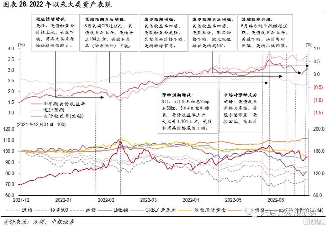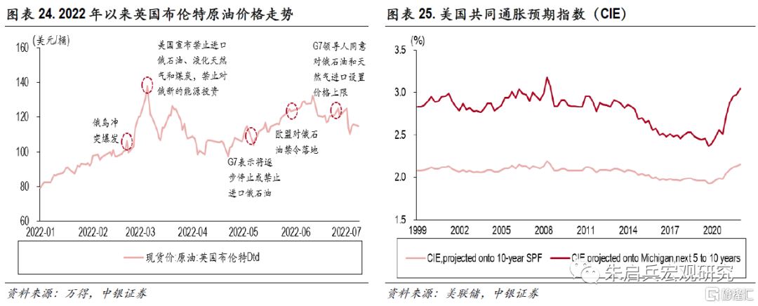 2022年以来,在俄乌冲突触发避险交易之后,全球市场在通胀交易和衰退交易之间不断切换:3月至5月中旬美联储先后宣布加息25bp和50bp以及缩表计划,紧缩预期增强下,美债收益率持续上升,美指升至104上方,美股和商品价格震荡下跌;5月中旬至6月上旬,由于市场对美联储紧缩充分定价,各类资产价格有所修复;6月10日发布的5月美国CPI数据超出市场预期,导致紧缩预期再次增强;6月15日至24日、7月1日至7日,市场对美国经济衰退担忧加剧,美债收益率回落,美股反弹,商品价格下跌,美元指数受欧元贬值推动,升至107上方;7月8日美国非农就业数据超出市场预期,美联储紧缩预期再次升温,美债收益率上升,标普500指数转为下跌,原油价格有所反弹(见图表26)。下半年,我们预计通胀交易与衰退交易的博弈延续。