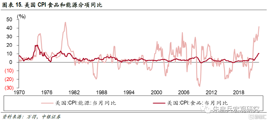 2020年新冠疫情暴发之后,受宽松政策推动,全球经济快速恢复,叠加欧佩克增产幅度持续低于预期,导致国际原油价格持续攀升,俄乌冲突爆发进一步加剧原油价格上涨,WTI原油价格最高升至123.7美元/桶。此外,受疫情影响,南美、东南亚等农产品主要生产区劳动力减少,导致农产品产量下滑。极端天气(例如拉尼娜现象、汤加火山喷发)频发、俄乌冲突使全球农产品供给“雪上加霜”。2020年至今,CRB食品现货价格最大涨幅为123%。2022年6月美国CPI食品和能源分项价格同比增速已经升至10.4%、41.6%,合计贡献了CPI增速的48%(见图表15)。