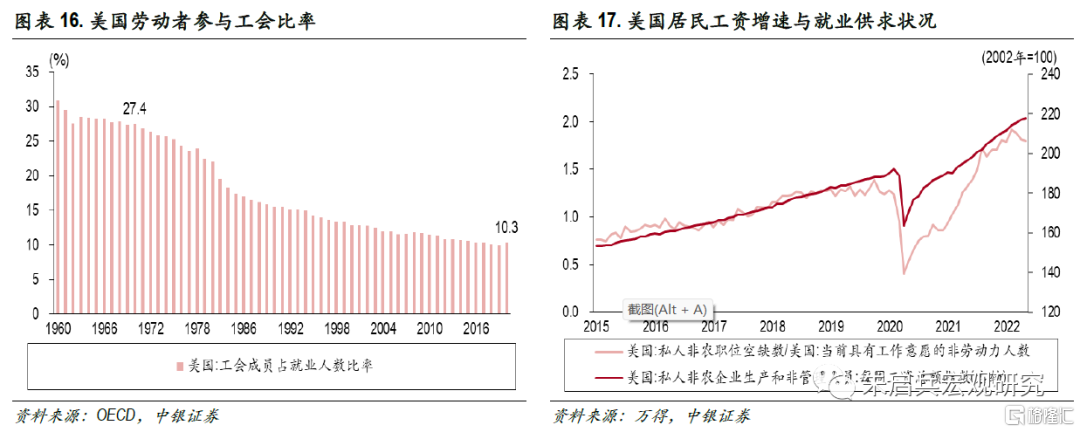 工会力量减弱,劳工议价能力下降。斯坦斯伯里和萨默斯(2020)的研究指出,劳工议价能力下降是解释近年来包括低通胀在内的宏观经济现象的重要原因 。从数据来看,1970年美国劳动者参与工会的比率高达27%,劳工议价能力较强是形成工资-通胀螺旋,推升通胀的重要力量;不过2021年该比率已经降至10%(见图表16)。这意味着,高通胀背景下,工资和物价上涨相互加强的动力较弱。并且,现阶段美国劳动力短缺已有边际改善(见图表17),预计工资增长对物价的推升作用减弱。