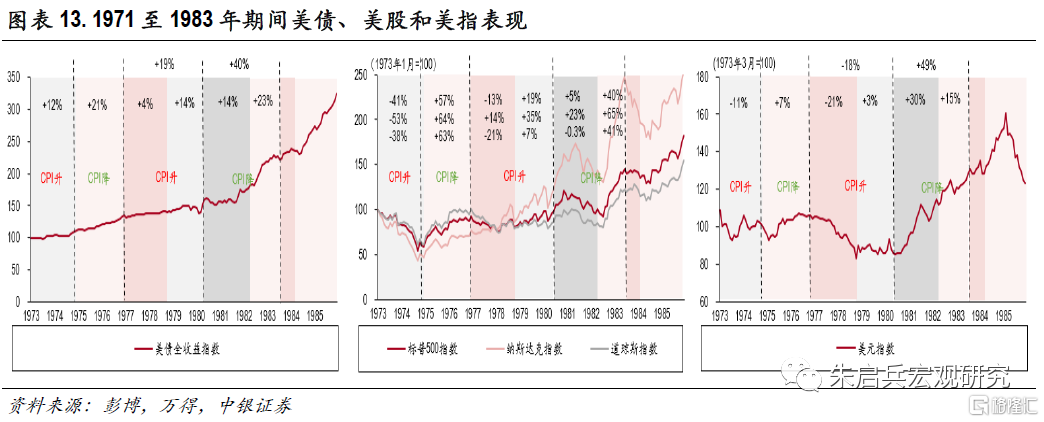 总结来讲,1973年至1983年,美国经历了从大通胀到通胀缓和的过程,期间实物资产表现总体好于金融资产。在实物资产中,原油价格在滞胀阶段涨幅最大,是因为石油冲击导致油价飙升,引发滞胀;黄金价格与CPI关系较大,在CPI上升时期,黄金价格表现最好,并且滞胀阶段表现好于经济过热阶段,体现出黄金的抗通胀特性;工业原料在CPI上升时期尤其是经济过热阶段表现最好,一方面是因为工业原料也是通胀的重要来源,另一方面是因为工业原料价格具有顺周期性,经济形势好,会增加工业原料需求,带动其价格上涨。在金融资产中,美债回报率在CPI下降阶段好于上升阶段,复苏阶段表现最好;美股在大通胀时期总体维持震荡,CPI见顶回落之后,尤其是美国经济从衰退转向复苏,美股表现最好;美元指数在1973年至1976年保持震荡,1977年10月至1978年10月快速贬值引发货币危机,1980年之后,沃尔克为反通胀采取的高利率政策引起美元持续升值(见图表14)。