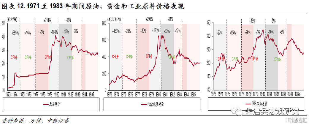 工业原料也是通胀来源。1973年至1980年5月,CRB工业原料指数累计上涨93%。大宗商品是企业生产成本的重要来源,也是通胀的重要组成部分。在两段滞胀时期,CRB工业原料累计分别上涨27%、6%,明显小于油价涨幅。由于大宗商品是顺周期资产,与全球经济走势正相关性较强。1973年至1983年期间,美国经济两段复苏时期,CRB工业原料累计分别上涨15%、6%;经济过热时期,累计上涨26%;而经济衰退时期,转为下跌-10%。