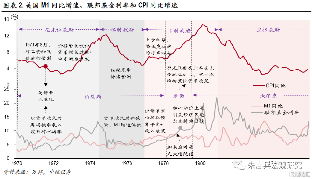 尼克松政府时期,以货币宽松换取价格管制。1970年伯恩斯正式就任美联储主席。在伯恩斯看来,工会是导致失业率居高不下和通货膨胀的罪魁祸首,只要缓解商人对工资上涨的担忧,决策者就可以实现经济增长并控制通胀。因此,尼克松政府时期,伯恩斯以货币政策为筹码,换取收入政策对抗通胀。1971年8月,尼克松宣布一系列措施,包括对工资和物价进行管制。价格管制和扩张性货币政策带来了1972年的高增长和低通胀。但1973年之后,由于价格管制手段逐步放松直至取消,以及货币增长过快,叠加中东战争爆发,CPI同比增速开始迅速飙升,最高升至1974年12月的12.3%。