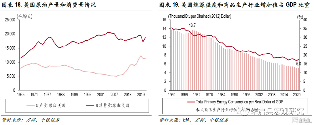 能源独立性提高,能源强度下降。1970年代,中东战争和地缘政治局势恶化带来了石油供应风险,叠加美国政府对能源市场存在过度管制,加重了对美国经济的冲击。第一次石油冲击之后,尼克松首次提出“能源独立”的设想,之后历届政府坚持通过各种政策和手段确保美国油气供应安全。直到页岩油气革命之后,美国大幅提高了原油生产自给能力,供需缺口明显收窄(见图表18)。并且,随着经济结构变化,2021年美国能源强度已经不及1970年的40%(见图表19)。这意味着,全球能源价格上涨对美国经济的冲击大幅减弱。