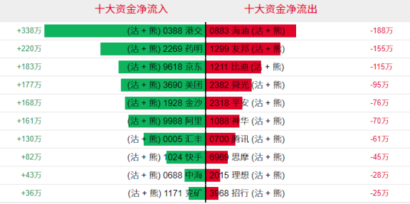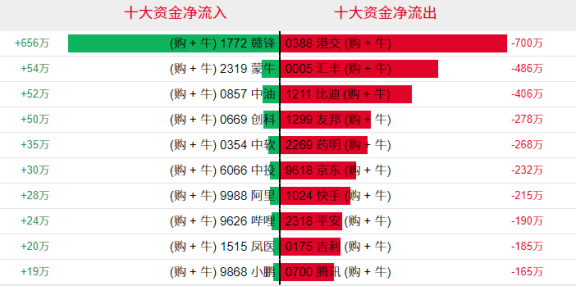 淡仓(认沽证及熊证)方面,周二港交、药明相关淡仓单日分别录得338万、220万港元资金净流入;相反,海油、友邦相关淡仓单日分别录得约188万、155万港元资金净流出。