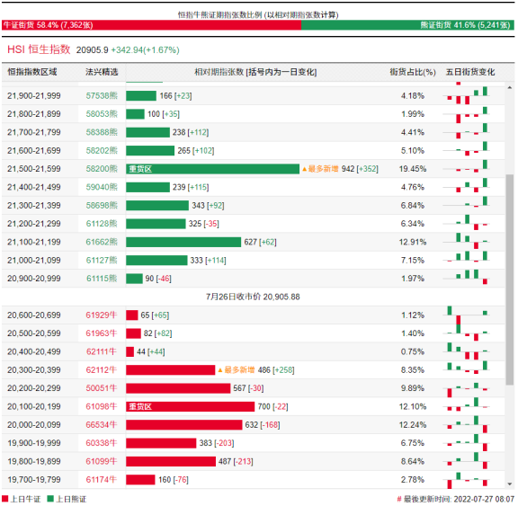街货分布方面,至周二,恒指牛证街货重货区间主要在收回价19900点至20400点之间,累计相当约2768张期指合约;恒指熊证街货重货区主要在收回价20900点至21400点,累计相当约1718张期指合约。