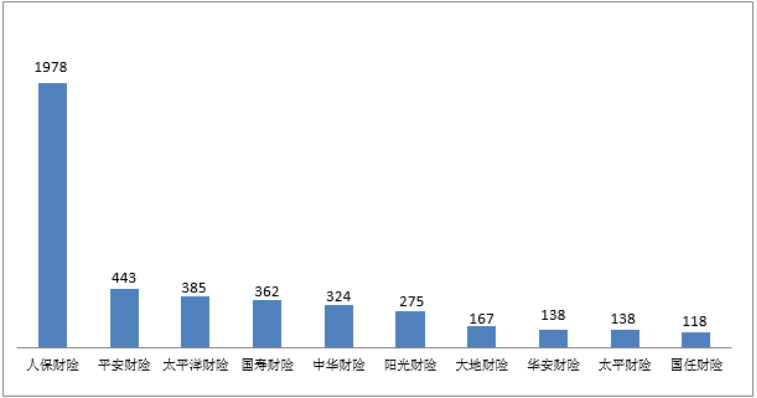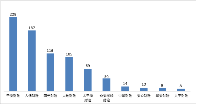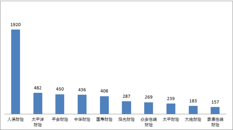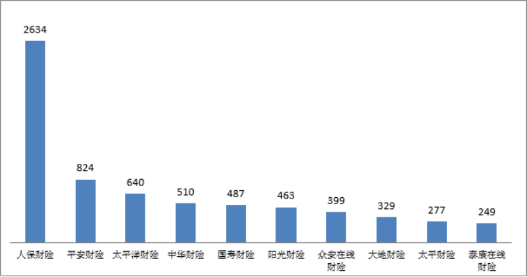 (一)人保财险投诉量位列财产保险公司第一。财产保险公司投诉量居前10位的为:人保财险2634件,平安财险824件,太平洋财险640件,中华财险510件,国寿财险487件,阳光财险463件,众安在线财险399件,大地财险329件,太平财险277件,泰康在线财险249件。
