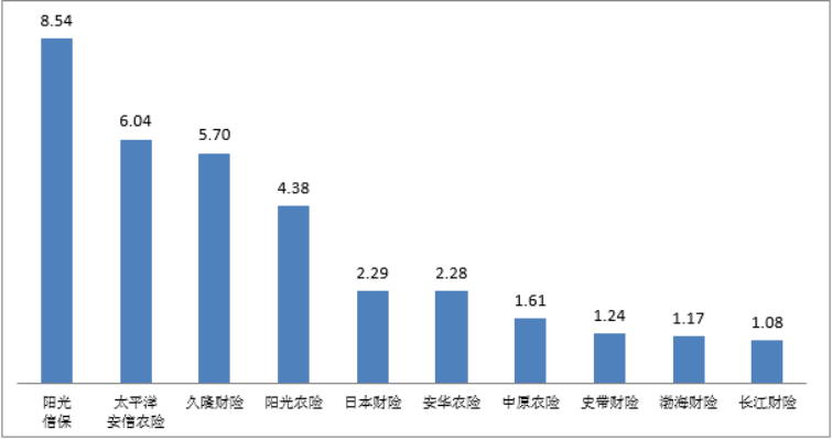 图四万张保单投诉量前10位的财产保险公司(单位:件/万张)