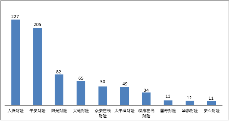 2.人保财险、平安财险的销售纠纷投诉量位列财产保险公司前两位。财产保险公司销售纠纷投诉量居前10位的为:人保财险227件,平安财险205件,阳光财险82件,大地财险65件,众安在线财险50件,太平洋财险49件,泰康在线财险34件,国寿财险13件,华泰财险12件,安心财险11件。