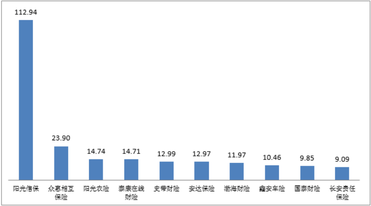 1.阳光信保、众惠相互保险的亿元保费投诉量位列财产保险公司前两位。2022年第一季度,财产保险公司亿元保费投诉量中位数为4.11件/亿元。其中,亿元保费投诉量居前10位的为:阳光信保112.94件/亿元;众惠相互保险23.90件/亿元;阳光农险14.74件/亿元;泰康在线财险14.71件/亿元;史带财险12.99件/亿元;安达保险12.97件/亿元;渤海财险11.97件/亿元;鑫安车险10.46件/亿元;国泰财险9.85件/亿元;长安责任保险9.09件/亿元。
