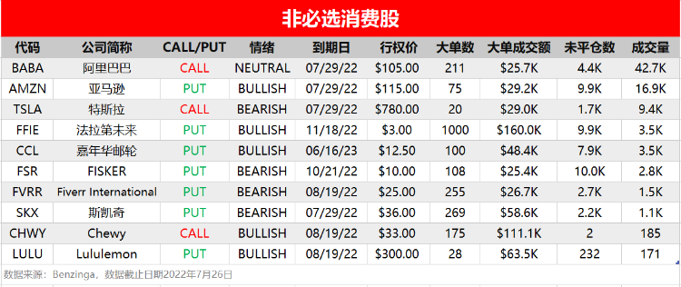 周二(7月26日),非必选消费、信息技术和通信服务板块相关个股出现较多活跃单,按照当日成交量排行,榜单TOP10分别如下: