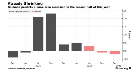 近日,以Jari Stehn为首的高盛经济学家发表报告认为,目前欧元区经济可能已经在萎缩,预计该地区经济衰退将持续到今年年底,第三季度和第四季度将分别萎缩0.1%和0.2%,随后在2023年才恢复增长。该行表示,欧元区经济下滑的原因有很多,包括来自俄罗斯的能源供应中断、疫情过后服务业反弹的结束、全球增长势头减弱以及意大利的政治动荡(这可能导致欧盟援助推迟发放)。