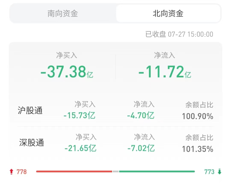 北上资金今日净卖出37.38亿元,沪股通净卖出15.73亿元,深股通净卖出21.65亿元。上一交易日净买入72.57亿元。