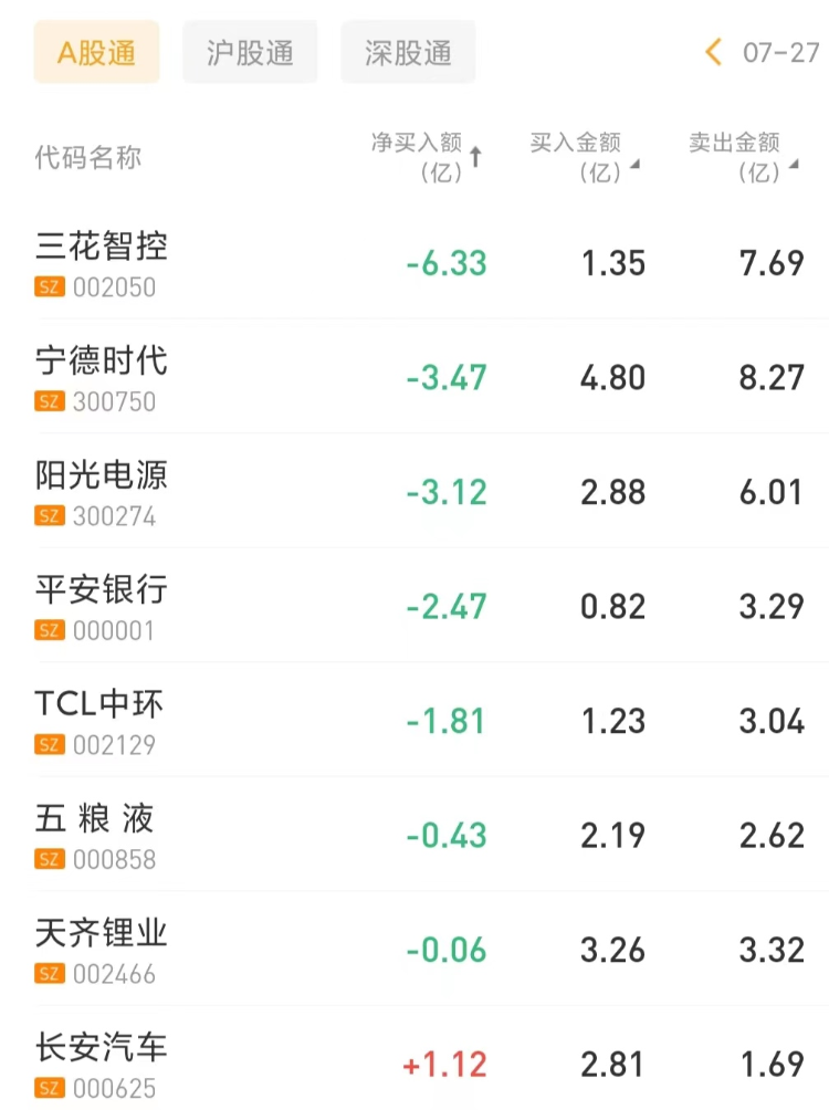 今日北上资金净卖出三花智控6.33亿元,宁德时代遭净卖出3.47亿元。