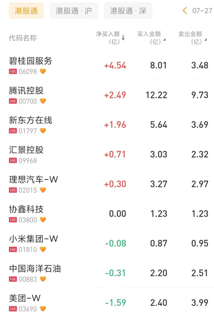 南下资金净买入碧桂园服务4.54亿港元,为今日买入之最。此外,南下资金净买入腾讯控股2.49亿港元,净买入新东方在线1.96亿港元。