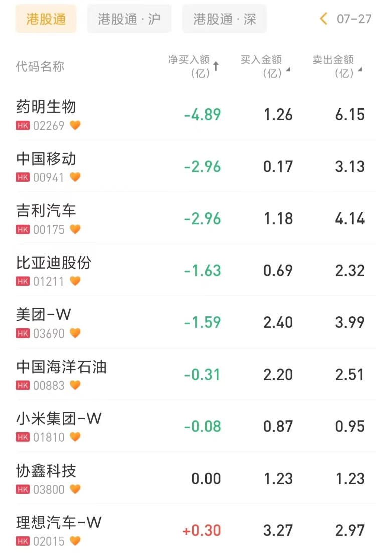 南下资金净卖出药明生物4.89亿港元,为今日卖出之最,净卖出中国移动2.96亿港元。