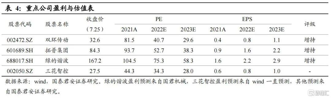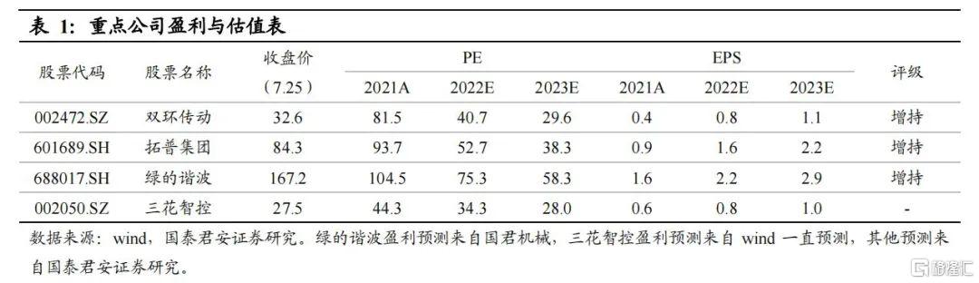 我们认为人形机器人中成本占比高、格局相对确定的关节及其相关部件将率先爆发,考虑新能源汽车与人形机器人在三电系统、传感系统、人机交互系统有相似或重合,特斯拉产业链上的核心供应商也有望受益,推荐标的双环传动、拓普集团、绿的谐波(国君机械覆盖),受益标的三花智控等。