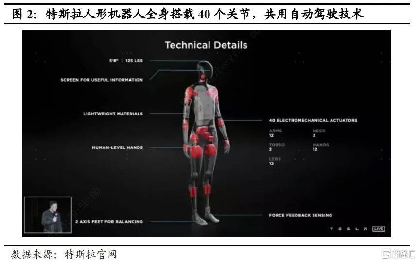 特斯拉人形机器人被命名为Optimus,最早将于2023年开始生产,用来填补劳动力缺口,执行危险、重复或太无聊而人们不愿意从事的工作。从公布的参数看,Optimus身高约172厘米、体重约56公斤、负载20千克,行走速度最高可达每小时5英里。身体由轻量材料覆盖,头部为扫描外界信息的屏幕,全身累计搭载了40个机电传动器。此外,该机器人采用特斯拉Dojo(道场)机器学习培训系统,芯片为自研AI训练芯片D1,和特斯拉共用自动驾驶软件系统(FSD)以及摄像头系统。