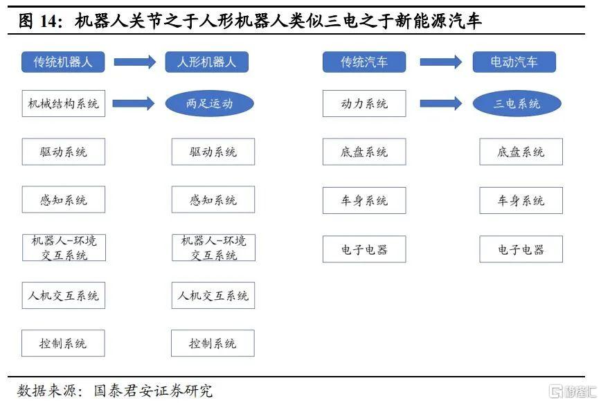 机器人关节及其相关部件是最重要的投资主线之一。与现有的工业机器人和服务机器人相比,人形机器人最大的变化在于机械结构系统,而关节是机械结构系统的基础,类似新能源汽车与传统汽车最大的变化在于动力系统,由原来的发动机+变速箱变成了三电系统,电池是三电系统中最重要的部件。