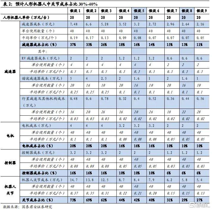 假设人形机器人平均价格20万元,规模效应下每个RV、谐波减速器价格下降至3000元和1000元左右,每个电机和控制器价格下降至500-800元和300-500元,那么对应的每台人形机器人关节成本占比约29%-42%,其中减速器成本占比13%-16%,电机成本占比10%-16%,控制器成本占比6%-10%。