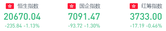 截至7月27日周三收盘,恒指跌1.13%,报20670.04点。碧桂园服务暴跌22%,碧桂园跌15%,领跌蓝筹。地产、医药、科技股跌幅居前。恒生科技指数大跌1.3%,万国数据、理想汽车跌超4%,阿里巴巴、明源云、哔哩哔哩跌超3%,腾讯跌近3%。