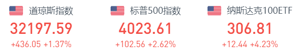 美股7月27日周三收盘,道指涨436.05点,涨幅为1.37%,报32197.59点;纳指涨469.85点,涨幅为4.06%,报12032.42点;标普500指数涨102.56点,涨幅为2.62%,报4023.61点。