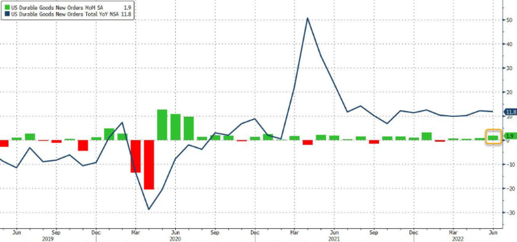 在金融环境持续收紧之际,美国商业投资依然保持坚挺。此前PMI和其他宏观数据意外下行,令分析师们预期商业投资可能会有所下行,但事实证明他们错了。受国防飞机订单激增影响,美国6月耐用品订单不仅没有下降,反而意外加速增加。美国商务部周三数据显示,美国6月耐用品订单环比初值增长1.9%,远高于预期的下降0.4%,高于5月的增长0.8%(修正值不变),此前已连续3个月增加。扣除国防及运输的耐用品订单继续超预期增长。数据显示,6月扣除国防的耐用品订单环比增长0.4%,高于预期的下降0.5%,前值增长0.7%;扣除运输的耐用品订单环比增长0.3%,高于预期的增长0.2%,前值增长0.7%。
