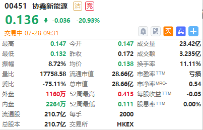 华盛资讯7月28让日消息,协鑫新能源折让近20%配售22.75亿股,公司股价现跌20.93%,报0.136港元,本次配售占比高达10.8%。