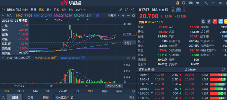 华盛资讯7月28日讯,港股教育板块持续走高,新东方在线涨近13%,天立国际控股涨超12%,新东方涨近9%,中教控股涨近6%,希望教育、思考乐教育跟涨。
