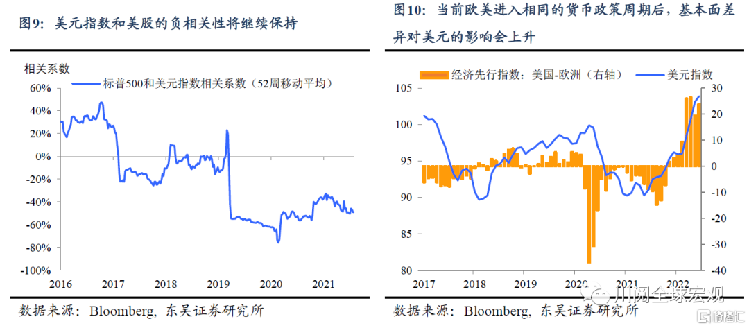 美元:风险资产的压力和欧元区的“躺平”是美元的动力源泉。疫情以来美元和美股一直呈现负相关性,我们认为这一关系在短期内不会扭转,风险资产的调整压力会继续支撑美元。而欧洲央行顶着滞胀加息的举措将使得美欧经济差距扩大,从历史上看当货币政策进入相同周期时,美欧基本面的相对变化对于美元的影响会上升(图9和10)。